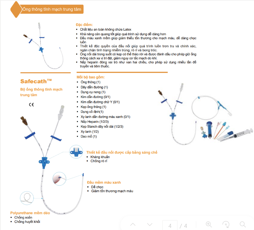Bộ ống thông tĩnh mạch trung tâm dùng một lần bao gồm: Ống thông, Dây dẫn, Kim dẫn đường, Ống tiêm